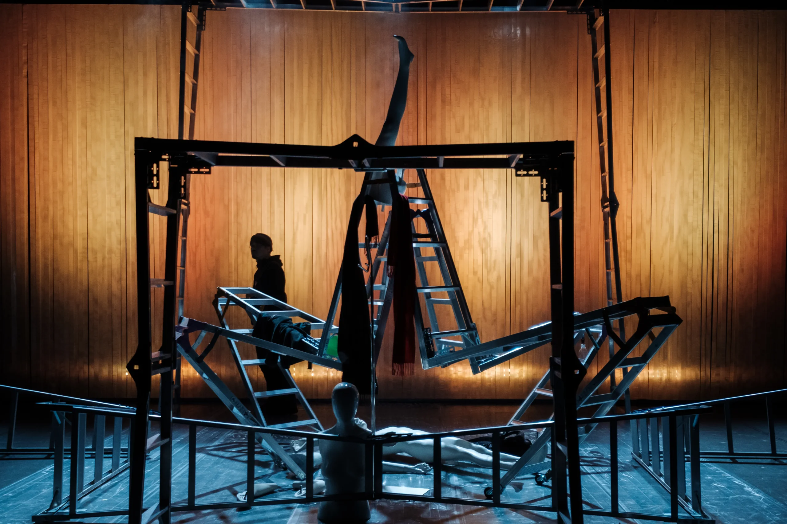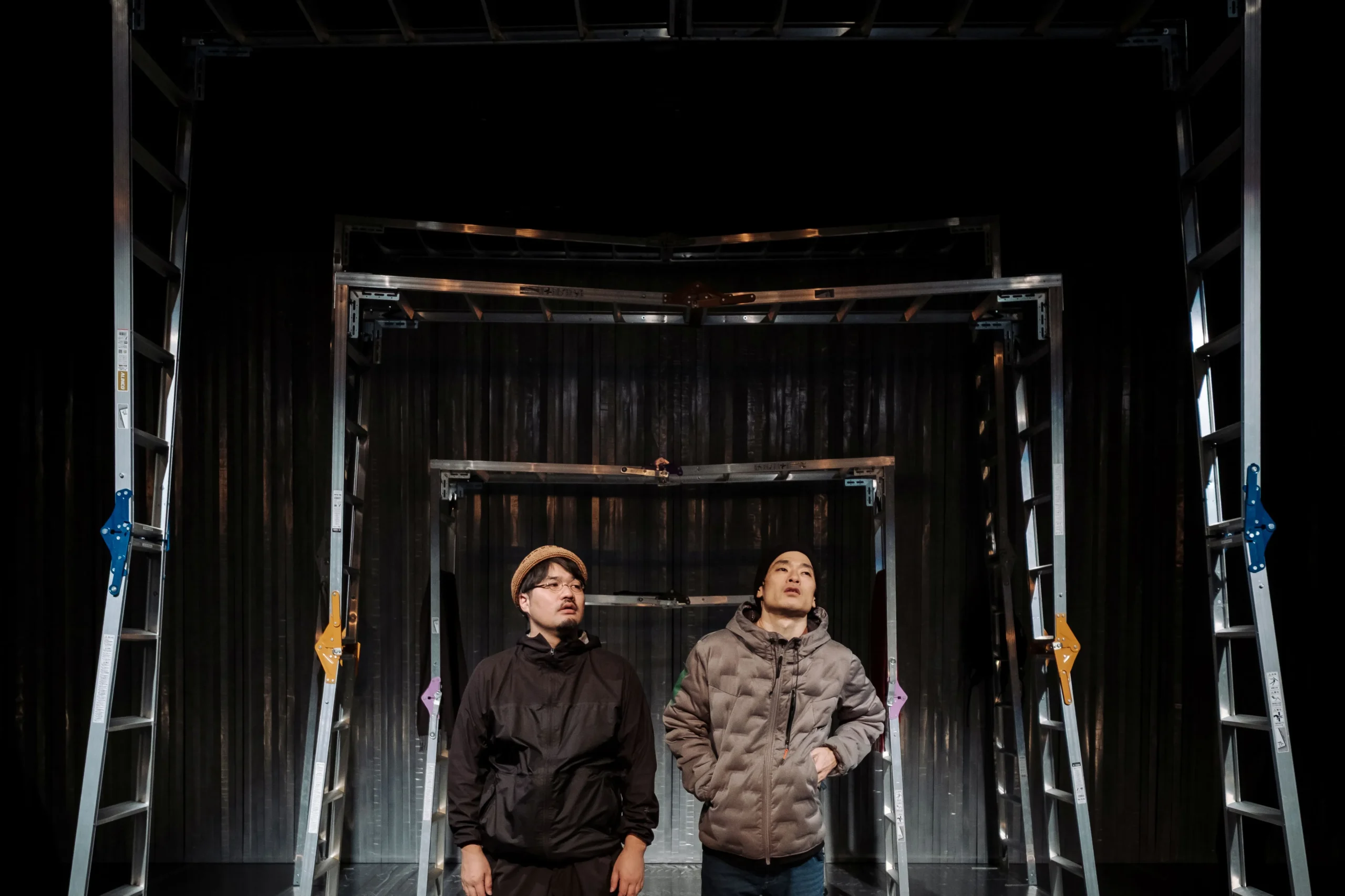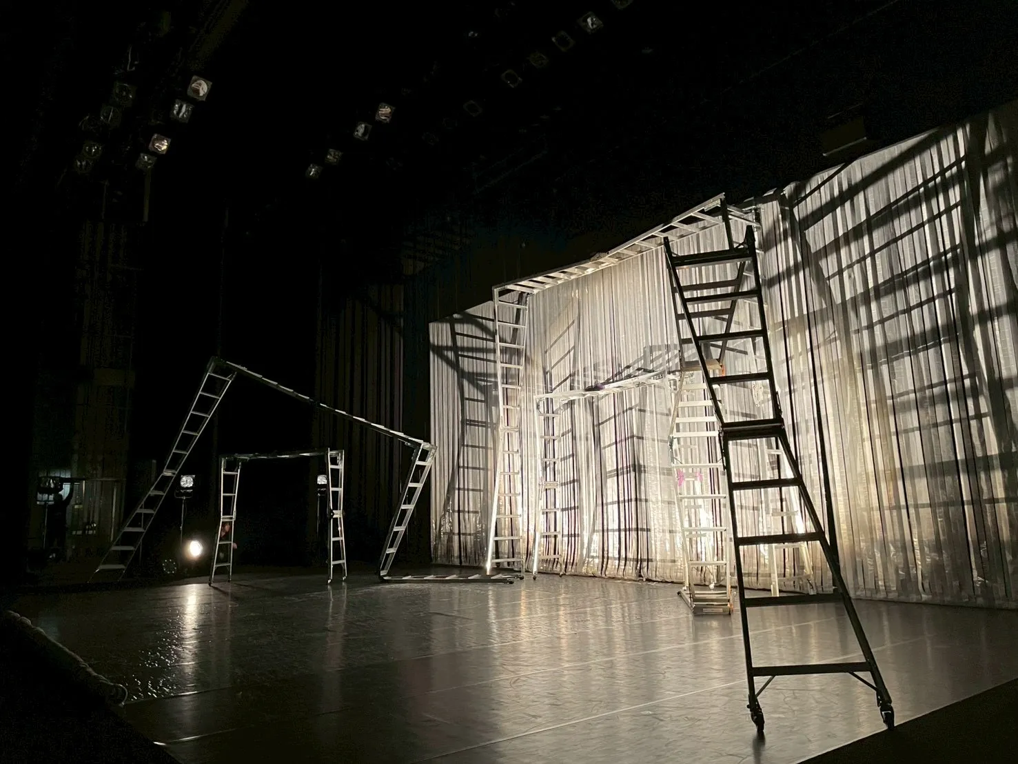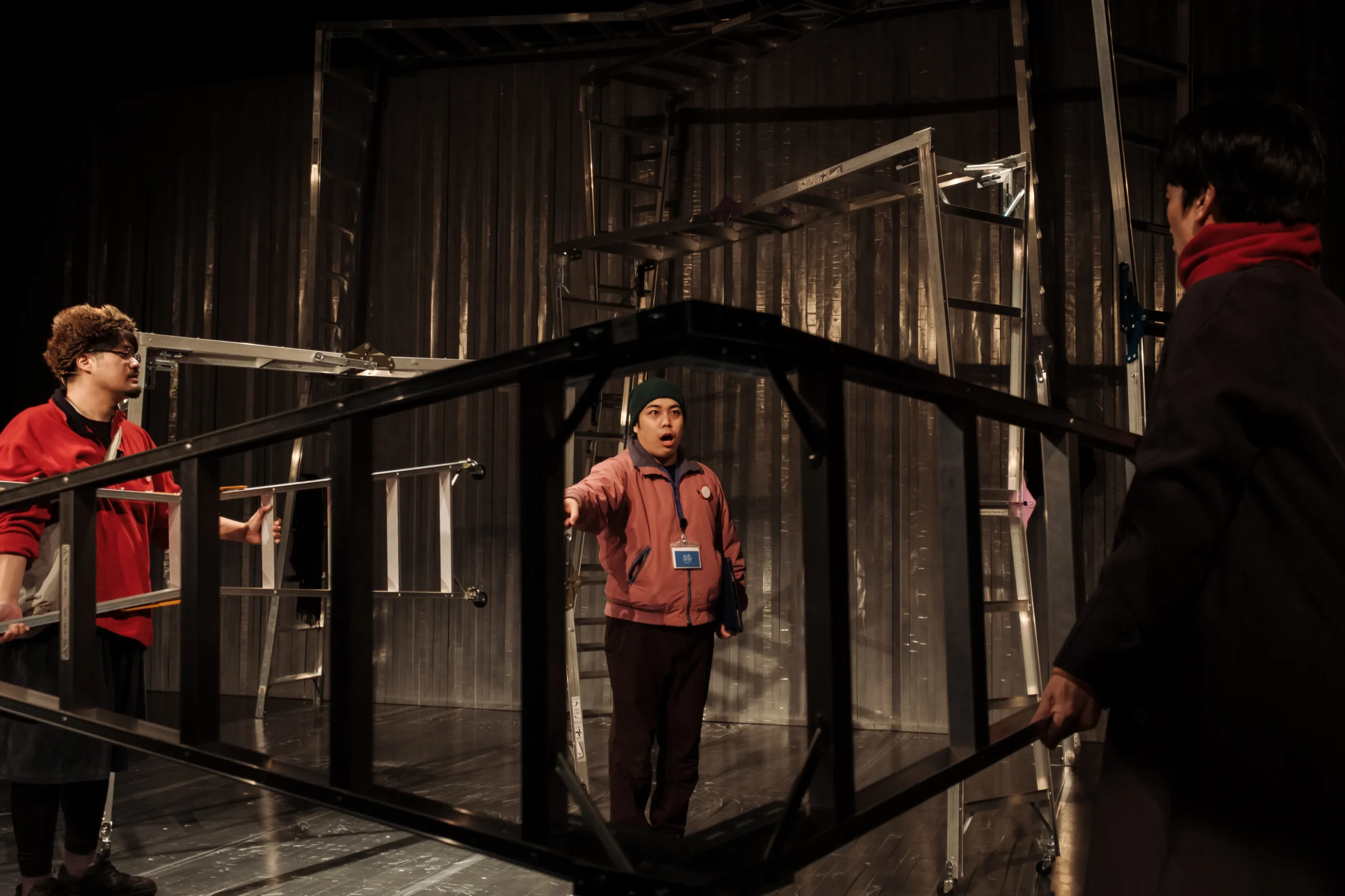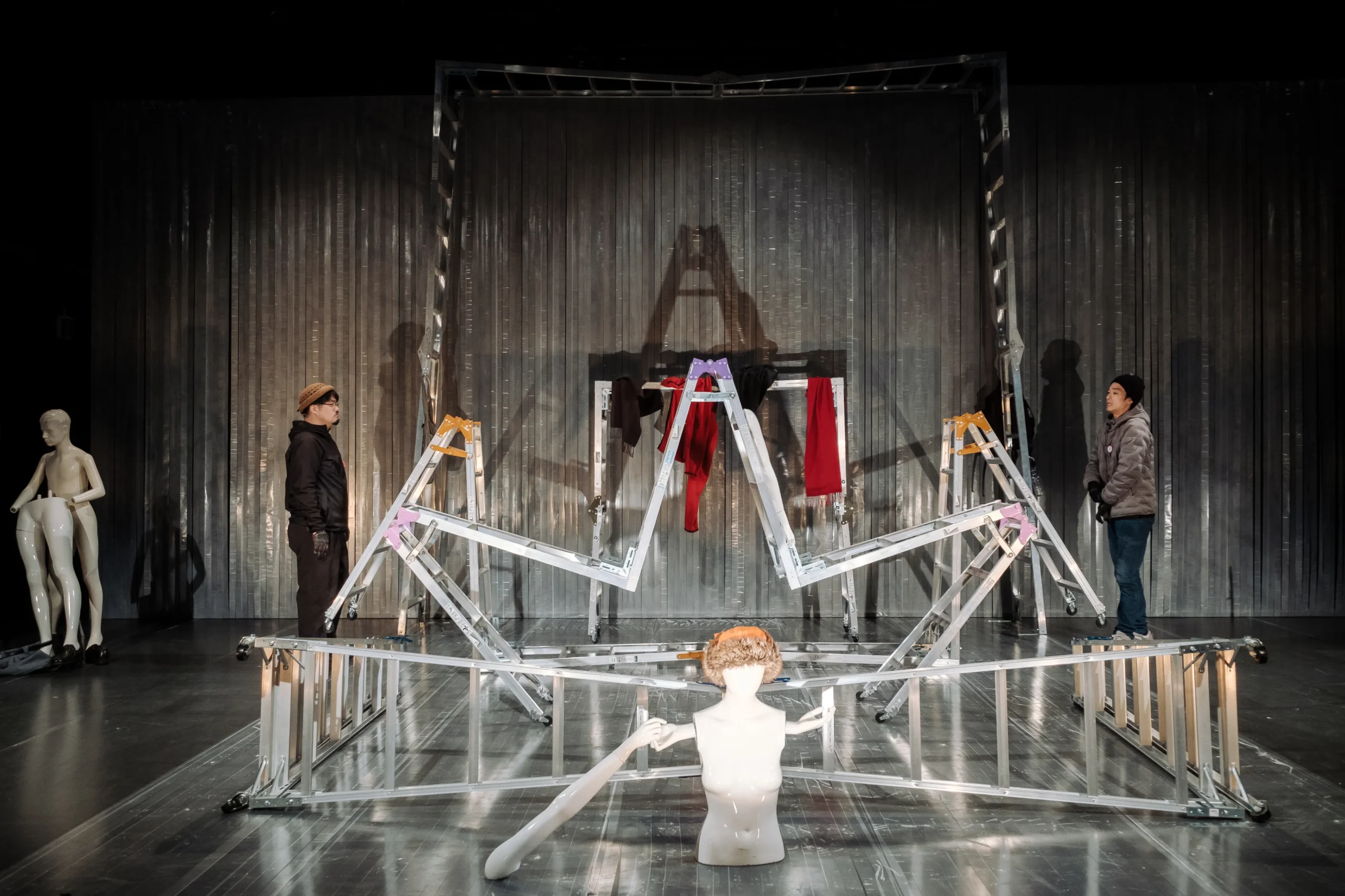 まっすぐに伸ばした3脚の脚立の端をコの字型につなげ、左に90度倒した物体。キャスター移動できるこの物体が、大小5基、舞台上に置かれている。その背景には、透明の養生テープが天井からすだれのように無数、垂れ下がっている。さらにその養生テープは床面を通って、舞台の地面まで貼られている。