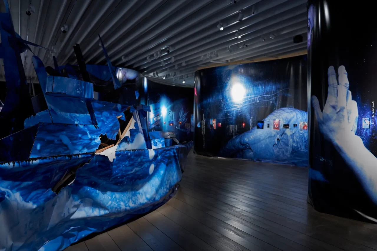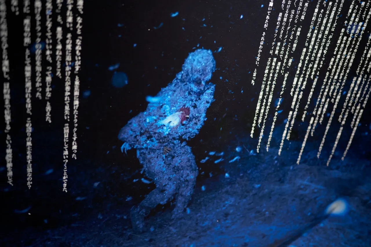 志賀さんの展示会場では、壁全体が大きく蛇行していて、無数の言葉や写真が境目なく、絵巻のように配置されています。作品の出発点は、志賀さんが宮城県ですれ違ったデコトラが掲げていた「なぬもかぬも」という言葉——「何でもかんでも」という意味の方言だそうで。そしてその空間にはずっとカエルの鳴き声が響いていて、異界との境界を感じさせる一角があったりと、自分が街中にいることを忘れるような、闇や大きなものを前に足がすくむような体験の場が立ち上がっていました。
