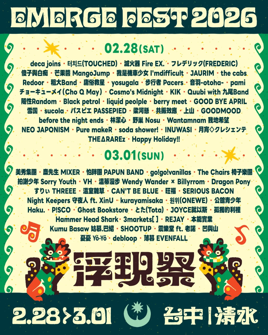 ⭓ |美秀集團|deca joins|JAURIM|터치드(TOUCHED)|滅火器 Fire EX.|麋先生 MIXER|怕胖團 PAPUN BAND|フレデリック(FREDERIC)|go!go!vanillas|The Chairs 椅子樂團|芒果醬 MangoJump|溫蒂漫步 Wendy Wander × Billyrrom|我是機車少女 I’mdifficult|拍謝少年 Sorry Youth|傻子與白痴|Dragon Pony|旺福|VH|すりぃ THREEE|とた(Tota)|Cosmo’s Midnight|SERIOUS BACON|pami|the cabs|音羽-otoha-|溫室雜草|庸俗救星|公館青少年|P!SCO|粗大Band|Haku.|チョーキューメイ(Cho Q May)|berry meet|원위(ONEWE)|Redoor|CAN’T BE BLUE|kurayamisaka|雪国|Ghost Bookstore|SHOOTUP|梁河懸|孤獨的利裡|REJAY|本能實業|凹與山|JOYCE就以斯|野巢 Nosu|KIK|林潔心|震樂堂 ft. 老諾|パスピエ PASSEPIED|INUWASI|Quubi with 九尾Band|NEO JAPONISM|yosugala|soda shower!|Pure makeR|月宵◇クレシェンテ|THEΔRAREz|Happy Holiday!!|debloop|共振效應|Hammer Head Shark|3markets[ ]|薄暮 EVENFALL|憂憂 Yō-Yō|sucola|隨性Random|上山|步行者 Pacers|Black petrol|Wantamnam 我地希望|Night Keepers 守夜人 ft. XinU|Kumu Basaw 姑慕.巴紹|GOOD BYE APRIL|liquid people|GOODMOOD|before the night ends|羊駝小姐 Malpaca|睿雞 RIKI|Quanzo & O.Dkizzya|Jimmy H. & HomeRich|Lavi 翁彤薰|O-VER-KiLL|AKIRA KURØ