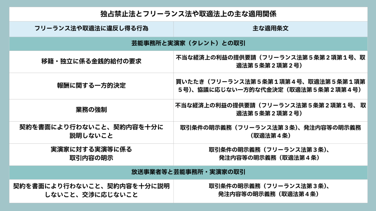 今回の指針の場合、厳密にいうと独占禁止法と取適法(中小受託取引適正化法)、フリーランス法(特定受託事業者に係る取引の適正化等に関する法律)の3つについての考え方をお示しした指針になります。
