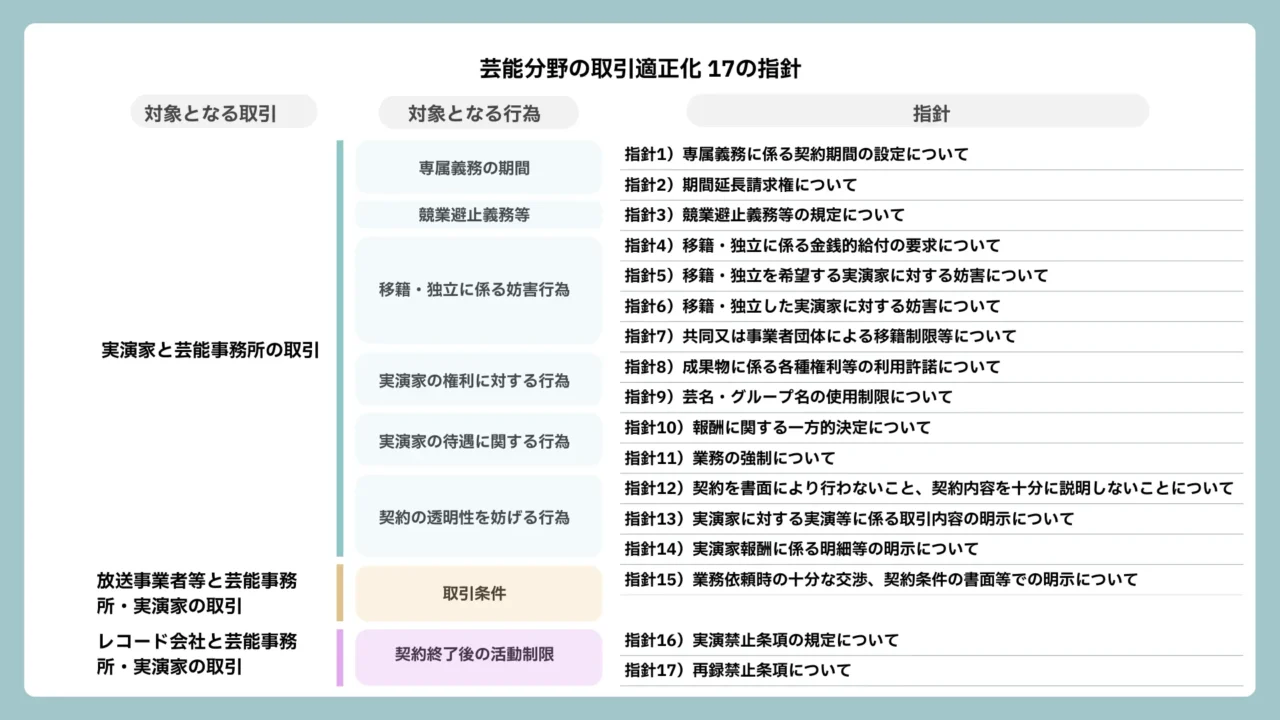 片岡:基本は、コンテンツ産業で働く人の健全な活動を促進するような取引を進める内容になっています。ヒアリング調査では芸能事務所を辞めた後に「一定期間は芸能活動をしてはいけない」とされたことがある、縛りがあるとの回答や、移籍しようとすると不当な賠償金を請求されたことがあるとの回答がありました。新しい指針では、こうした実質的に自由を奪うような縛りは原則として規定すべきではないとし、タレント(実演家)が自分の意志で移籍や独立をすることを阻害されないようにしています。一方でタレントに対し投資をしている場合は、合理的な範囲で回収について事前に取り決めをしておくことが望ましいことなども示しています。