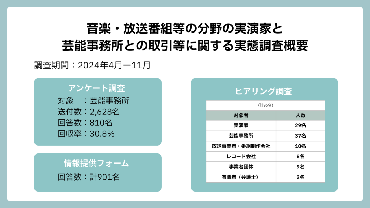 片岡:今回は、全国の芸能事務所にアンケートをお配りし、その後、実演家や芸能事務所、放送局やレコード会社などの関係者95名にかなり集中的に、大体1件1〜2時間かけてヒアリング調査もさせていただきました。