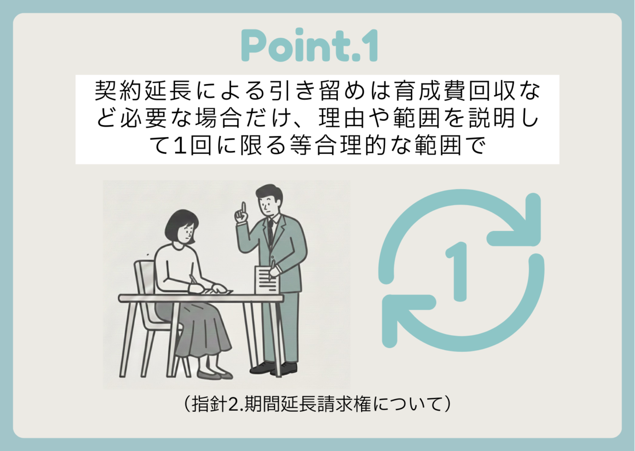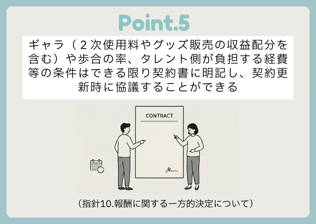 この部分に関して言うと、独占禁止法上で直ちに違反になるわけではないのですが、後でトラブルになった場合、事務所側が強い立場だったとなると「優越的地位の濫用」といって、独占禁止法上の「不公正な取引方法」に当たる場合がございます。そういうシチュエーションを誘発しないように、事前にできるだけ対処していただきたいという意味でお示ししています。