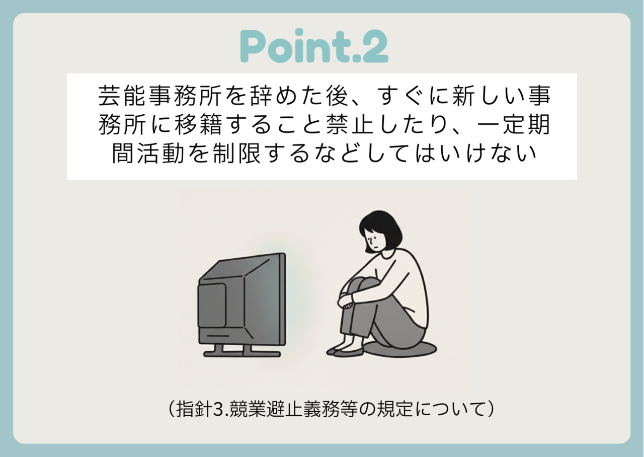「干される」という言葉がありますが、タレントが事務所を辞めて移籍・独立することを不当に邪魔したり、独立した後で悪いうわさを流したり、テレビ局などが「前の事務所に気を使って、そのタレントを番組に出さない」といった忖度をすることがあるとのタレントの回答も実態調査でみられました。指針では、移籍・独立したタレントの活動を妨害するような言動をしてはならないことを示し、放送局にも忖度などせずに自主的な判断でタレントの起用などを行うよう求めています。
