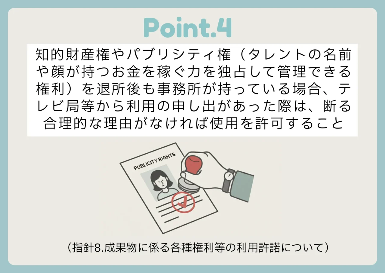 片岡:また、タレントの報酬などが「いくらもらえるのか」「いつ支払われるのか」といった大事なことを、事務所や放送局は、事前にきちんと書面(またはメールなど)で条件を伝え、お互いに納得した上で契約しなければなりません。不当に安い報酬を押し付けることや本人の意志に反した仕事を無理やり押し付けることもしてはならないとされています。退所後に芸名やグループ名、所属当時の写真や映像を使うことも制限を行うことなどに合理的な理由がない限り許可するよう求めています。