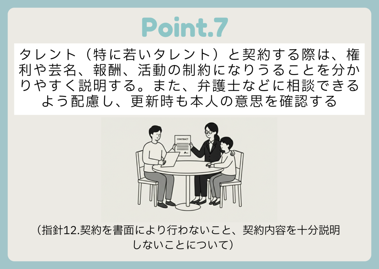 森崎:これに関しては、「指針1」の「取引適正化のために参考となる行動例」にも重要なことが書かれていまして、「未成年の実演家に対する契約内容の説明の際には、必ず親権者(法定代理人)に同席してもらっている。さらに、その場で署名させることはせず、初回は契約期間を含む契約内容の説明にとどめ、契約書案を持ち帰って確認してもらう」と例に挙げられています。当協会でも保護者の方からお子さんの事務所との契約について相談をいただくことがあります。未成年の場合の法定代理人の立ち会いや、弁護士に相談できる配慮について書かれているのは、非常にありがたいと思います。