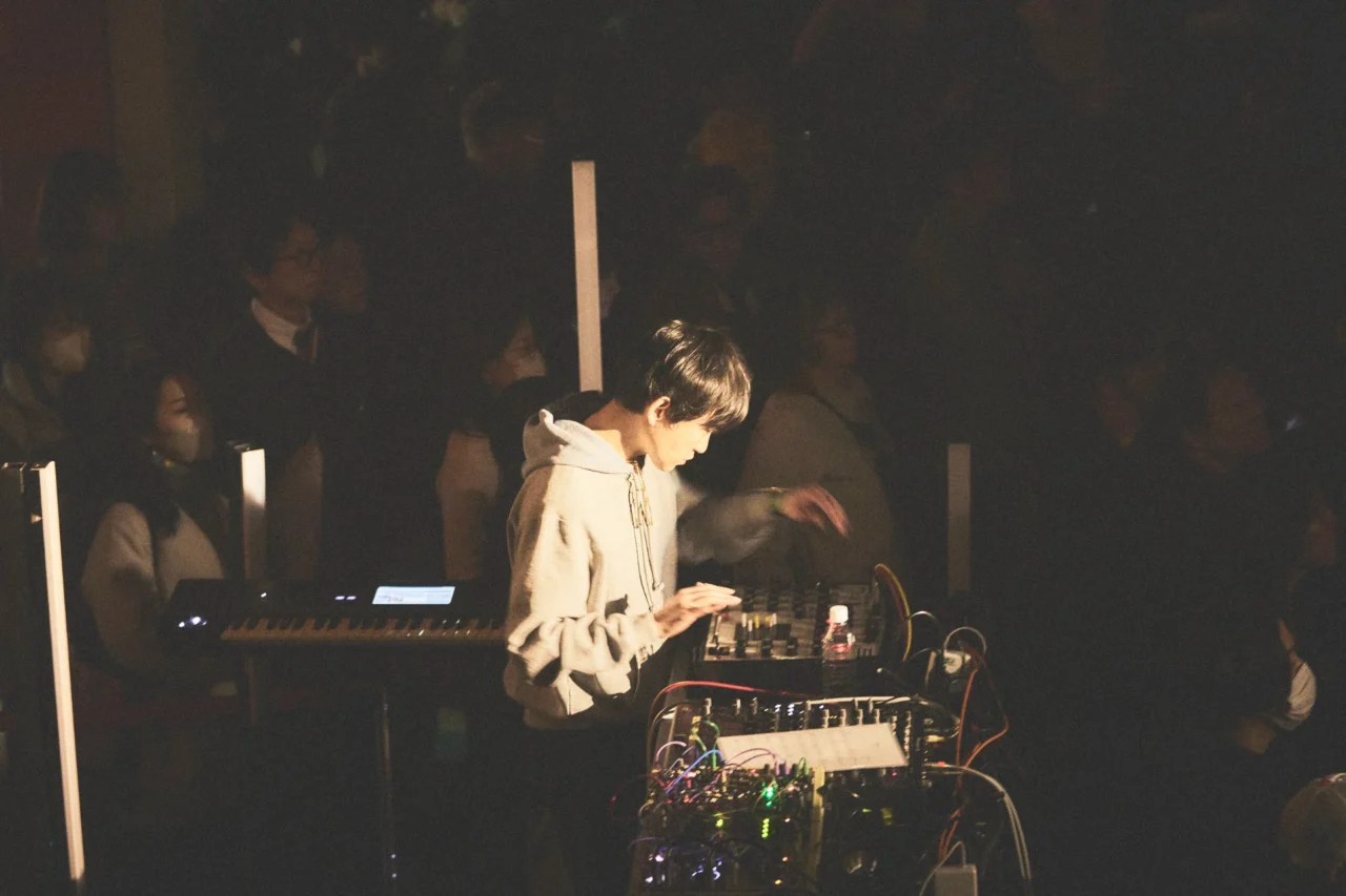 すでに始まっている蓮沼執太 + Cwondo + 野口文のステージを観るため、duo MUSIC EXCHANGEへ移動。こちらのステージでは蓮沼執太がキュレーションする『HEAR HERE -GATHERING 3』が行なわれている。2025年に大きな話題を呼んだ展覧会『坂本龍一 | 音を視る 時を聴く』や『sakamoto common OSAKA 1970 / 2025 / 大阪 / 坂本龍一』でも実施した、「環境としての音楽」「聴取の実験」をテーマにしたプロジェクトだ。