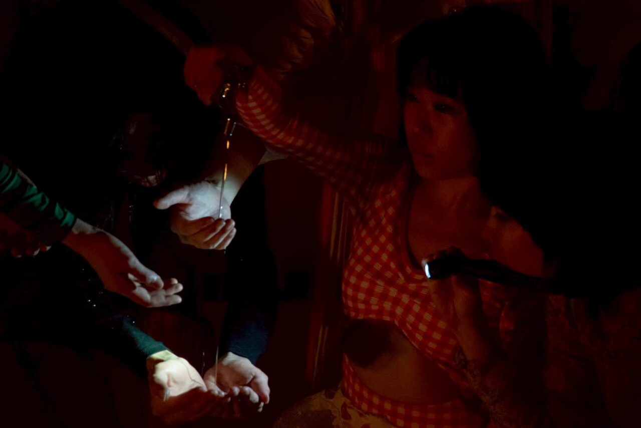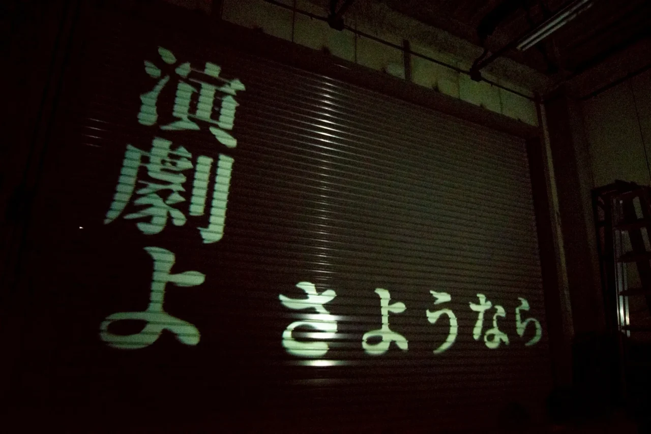 そして、ローションまみれとなったかれらは、それまで閉ざされていた劇場のシャッターを開け、ゆっくりとした動きのままに劇場の外へと出ていきます。