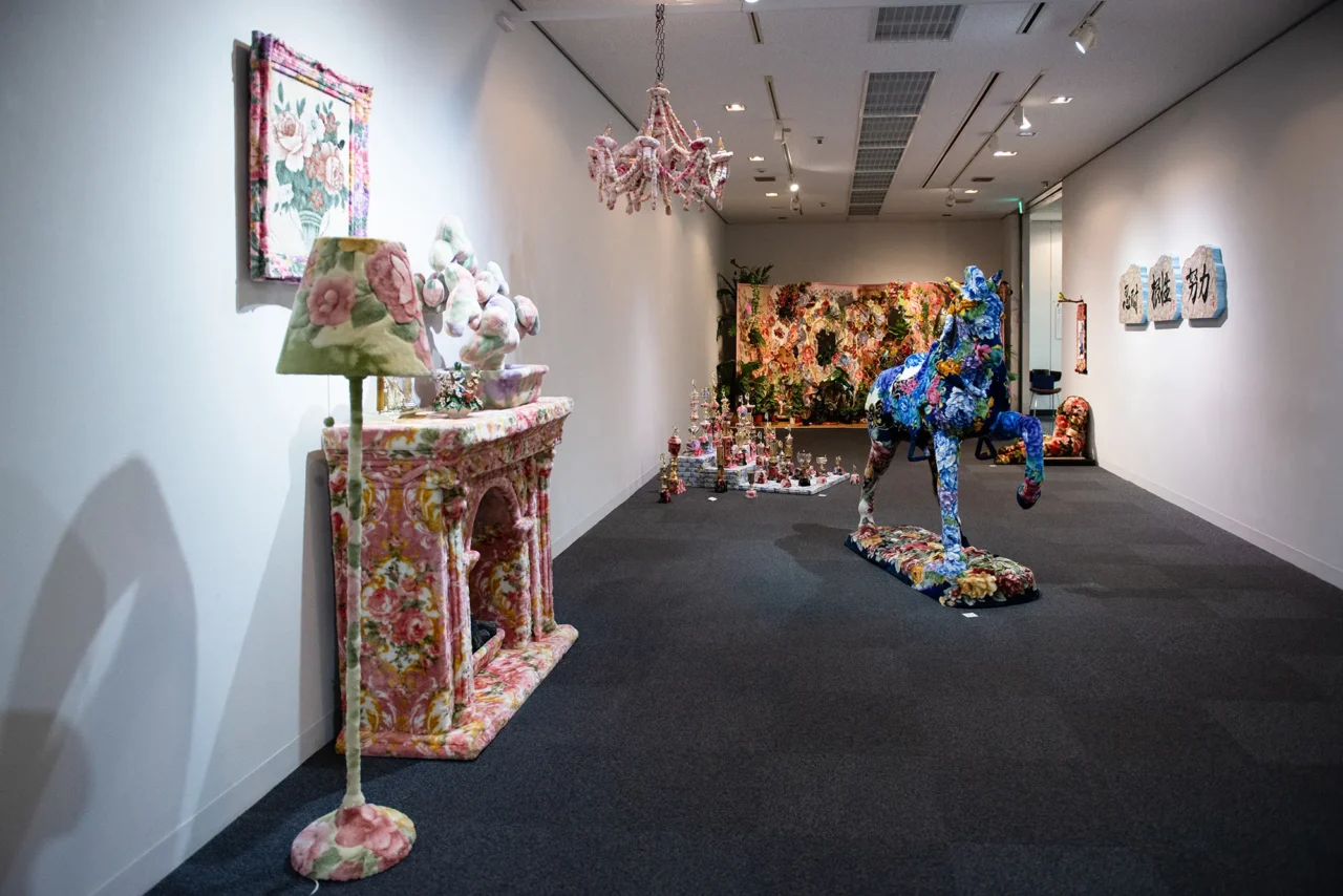 花柄毛布を用いた作品制作を始めてから10年が過ぎ、展示空間には江頭の思考の軌跡といえるものが表現されている。さらには展示空間の外となる、地下1階から地上3階までを貫く吹き抜け部分にも花柄毛布がかけられるなど、美術館では珍しい光景を展開。作家のコメントを交えながら、展示を観ていきたい。