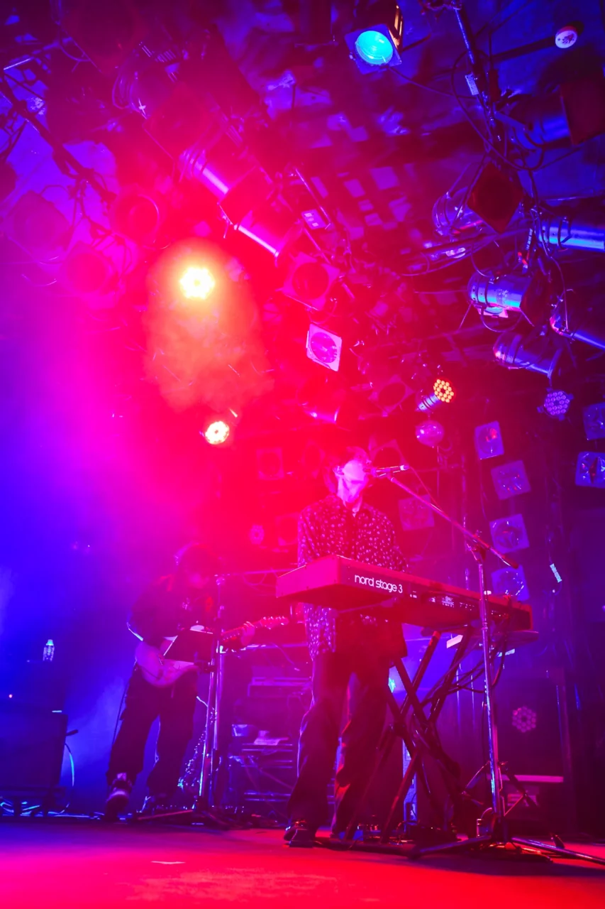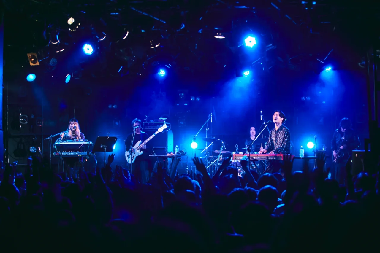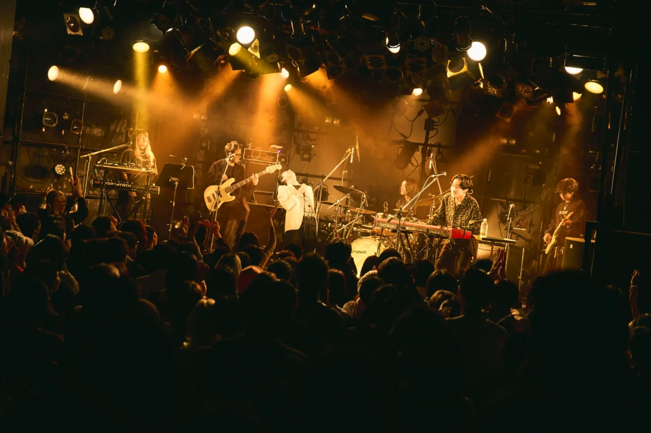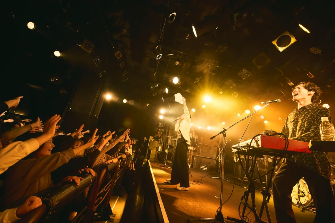 そう告げて始まったのは“hanashi”。イントロが鳴った瞬間、客席から歓声が上がる。手拍子が自然に広がり、レイドバックしたドラムのうねりの上で、MELRAWはディレイを効かせたギターを響かせる。ネオソウル的な質感を持つこの曲は、終盤に向かうにつれてさらに熱を増していき、エンディングではリズムがスウィングしたり、フィルが細かく乱れ打たれたり、倍テンにもハーフタイムにも感じられるようなスリリングな展開を見せる。「最後は踊って帰りましょう」と言って“RIDE”へなだれ込むと、フロアは大きく揺れ、オーディエンスは手を高く掲げて応える。ミラーボールの光も相まって、会場はまるでダンスフロアのような熱気に包まれた。