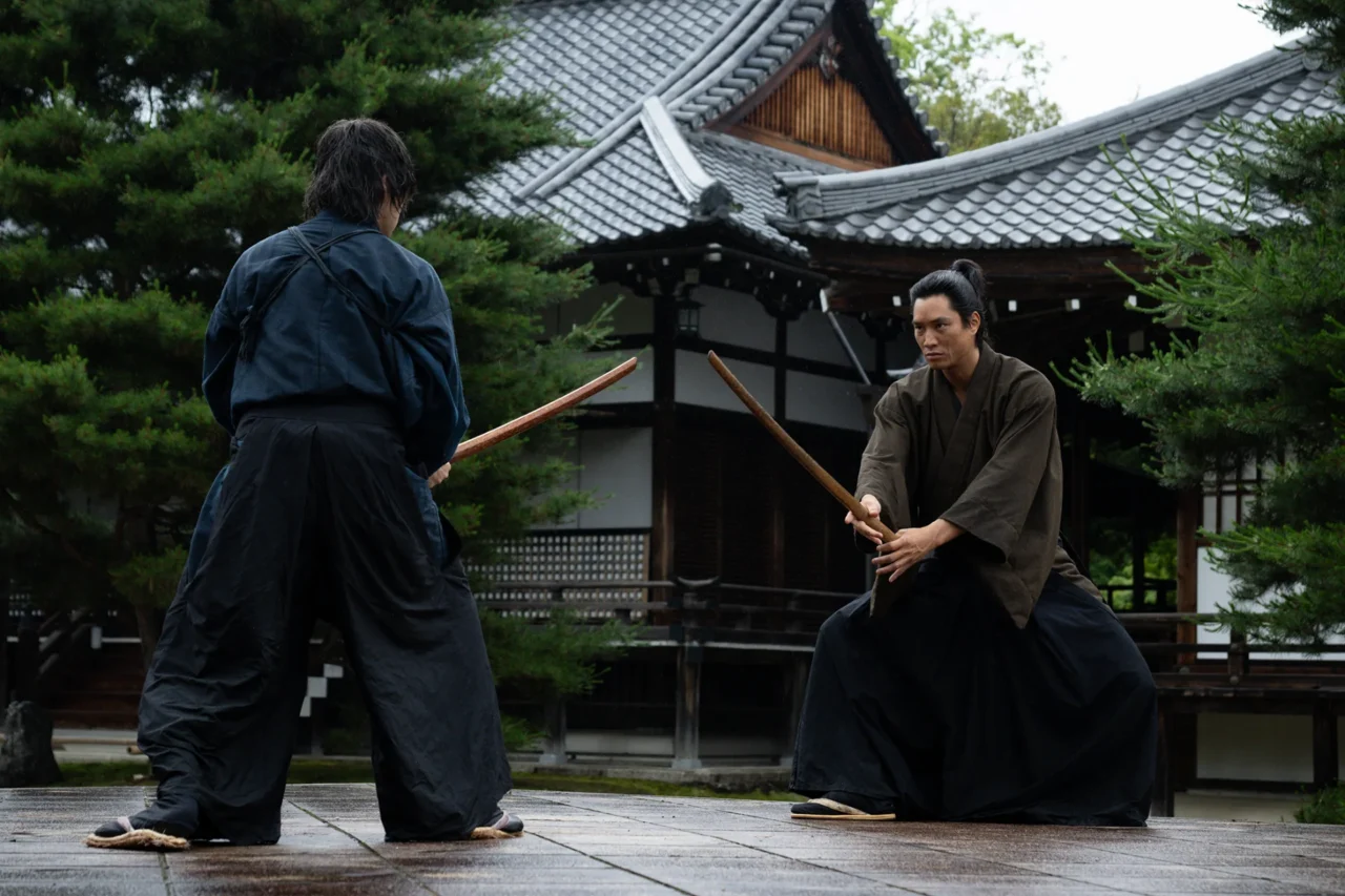 道場長の近藤勇が、土方の挑戦を受けて立つ。鈴木伸之が演じる近藤は笑顔の眩しい好漢だが、その剣術は土方以上にえげつない。鍔迫り合いからの大外刈りで倒し、そのまま木刀を振り下ろす。土方の袴の裾を踏んで転倒させるような、ダーティーな技も使う。