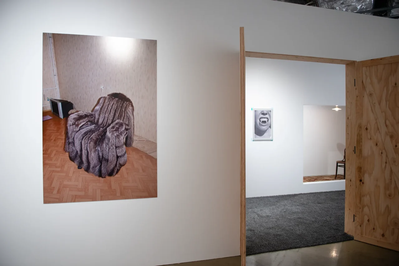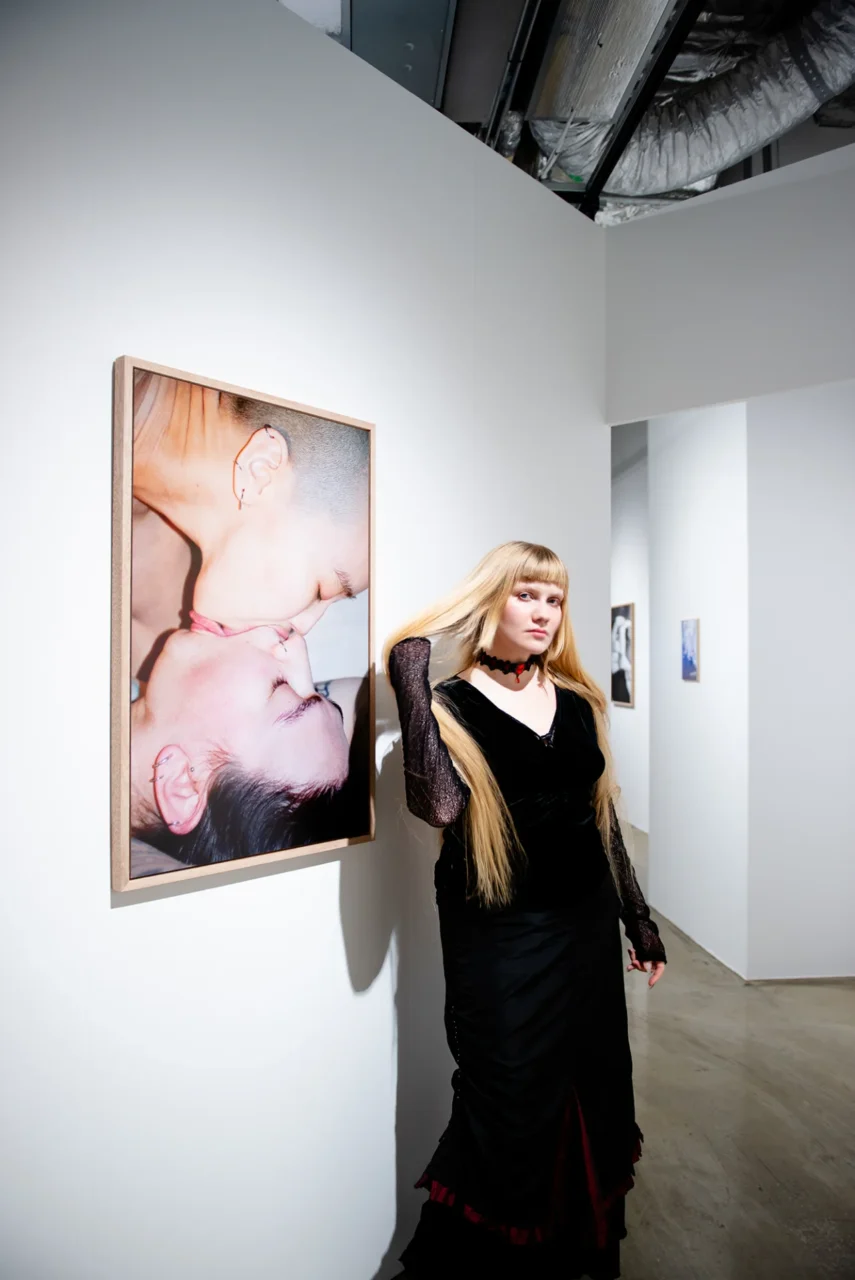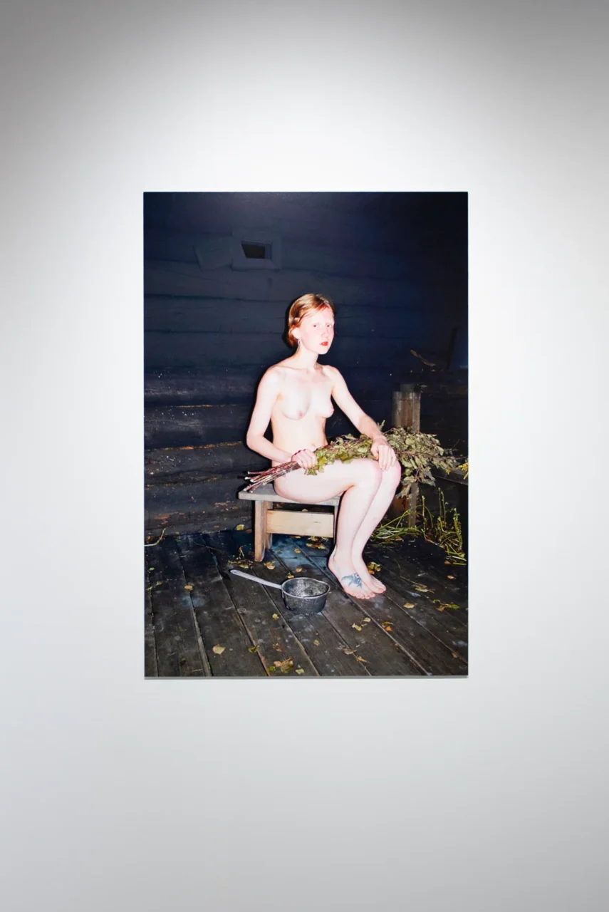 ロシアには、裕福な家庭かどうかにかかわらず、「ダーチャ」と呼ばれる別宅を田舎に持つ風習がある。週末や長期休暇を過ごすための農園付き別荘のようなものだ。コロナ禍、都会を離れて田舎のダーチャに知人たちと集まった中で撮影したシリーズから着想を得て、展示空間はダーチャをイメージして構成されている。中に足を踏み込んで鑑賞すると、一見するとエキセントリックな印象のある作品が並ぶが、エロティックになりすぎず、過激に挑発する表現に走っているわけではないことが画面から伝わってくる。撮影者であるクリスティーナとモデルたちとの親密さから彼女たちのパーソナルな世界を想像させ、また同時に、ロシアの風土を読み取ることもできる。