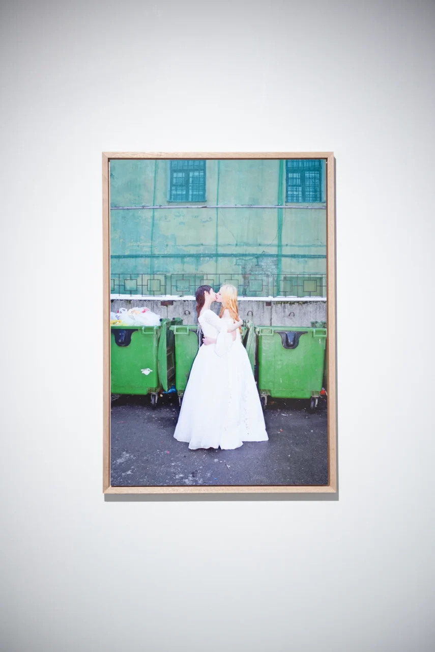 あまり意図的に演出することはないと先ほど言いましたが、この写真は珍しく、自分の中に持っていたイメージを形にした作品です。レトロなウェディングドレスを着た女性のキスシーンを撮りたくて、このドレスを所有していたフォトグラフィカの先生にお願いして貸してもらいました。学生の写真を20枚撮ったらドレスをくれるという条件だったので、その先生の学生を撮影してドレスを譲り受けました(笑)。ひとりは私の知り合いで、金髪の方の女性は、私ももうひとりもそのときが初対面の女性です。